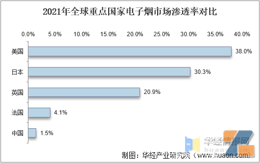 随着PMTA通过IQOS以及VUSE SOLO的认证,电子烟的替烟属性以及部分减害属性得到美国药品管理最高执法机关认证,美国市场对电子烟的接受度较高,电子烟渗透率高达38%,日本和英国电子烟渗透率分为位居第二和第三,为30.3%、20.9%。中国电子烟相关行业监管较为严格,且禁止线上平台销售,目前电子烟市场渗透率仅为1.5%。