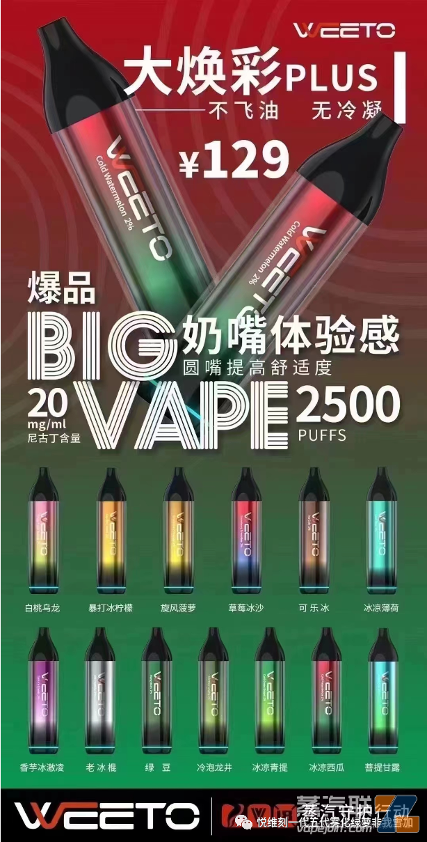WEETO大焕彩电子烟是近期非常火的一款一次性电子烟,主要做的是大口数,高达2500口的口数,官方零售价是129元一根,这比大多数换弹设备是要划算很多的。