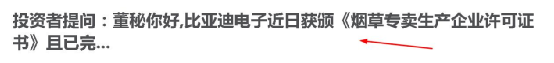 8月14日消息,近日看到,有投资者在投资者互动平台提问电路板巨头的中京电子,其问到“比亚迪电子近日获颁《烟草专卖生产企业许可证书》且已完成专利布局及生产线投建。请问贵公司是否与比亚迪电子在电子烟领域有合作?”