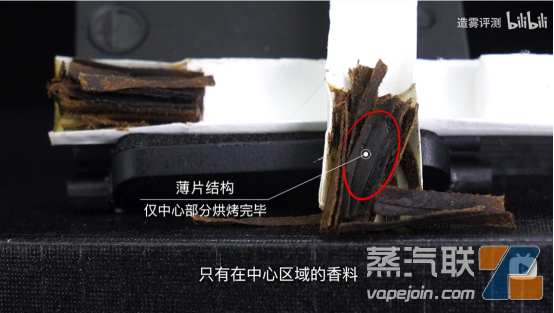 在完整抽吸完一颗烟弹后,明显的可以看到只有在中心区域的香料被烘烤完毕了,而边缘的香料基本上只是充当了一个填充物的角色