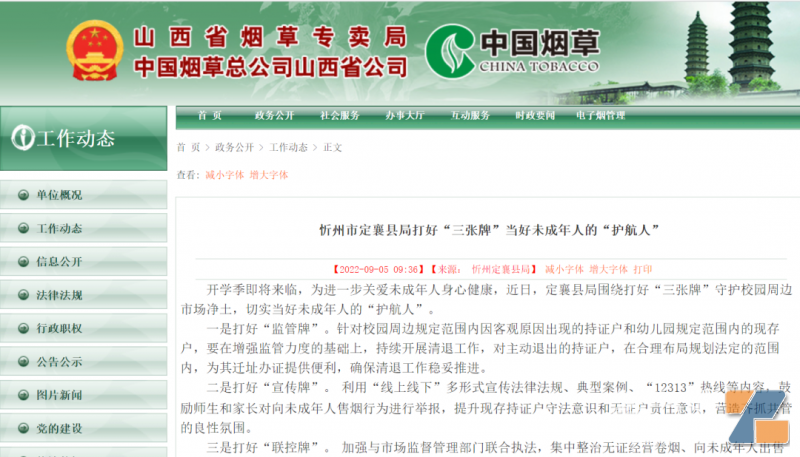 消息显示,定襄县局一方面是打好“监管牌”,针对校园周边规定范围内的持证零售户,在加强监管的基础上开展清退工作,为主动退出的持证户,在合理布局规划的范围内,为其牵址提供便利;另一方面是打好“宣传牌”,即利用线上线下多种形式宣传法律法规、典型案例,并鼓励师生和家长对向未成年人售烟行为进行举报。