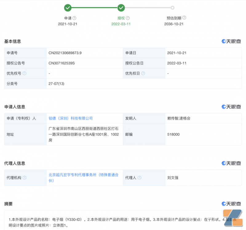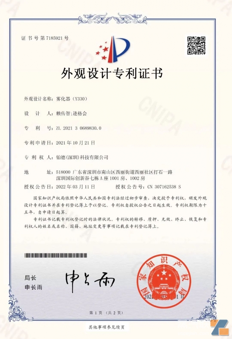 “铂德·盛世”产品于2020年底完成产品设计,并成功申请了外观专利。目前,“铂德·盛世”电池杆以及相对应的“津巴烟草”、“稻城烟草”、“猫儿山烟草”、“亚丁烟草”4款口味烟弹均「已通过国标审核」。