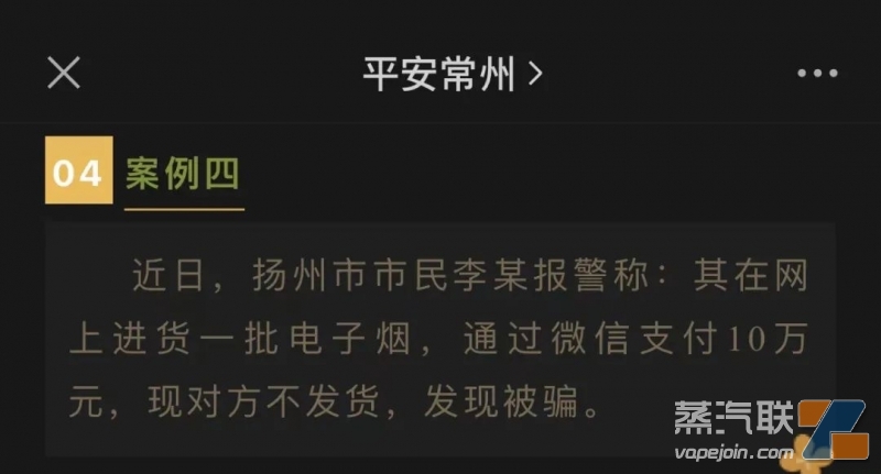 9月20日,常州市公安局微信公众号“平安常州”发布的推文《警惕“网售电子烟”骗局》提到了四个典型案例,其中案例四便提到:“近日,扬州市市民李某报警称:其在网上进货一批电子烟,通过微信支付10万元,现对方不发货,发现被骗。”