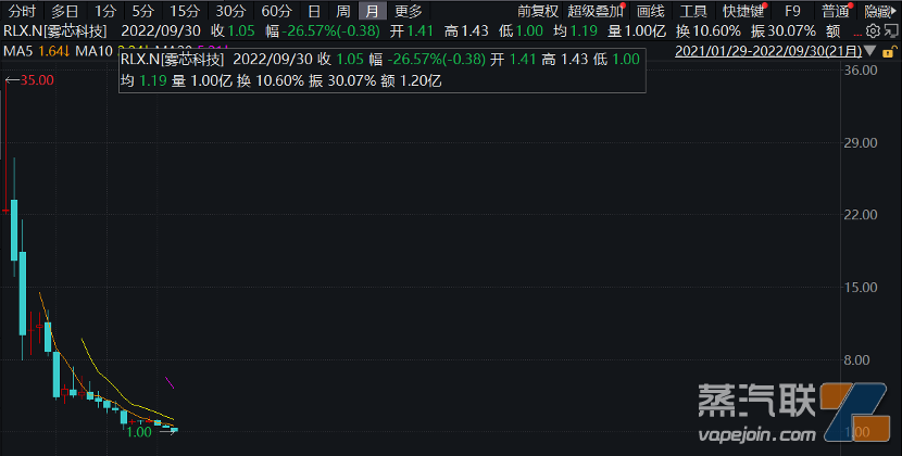 其中,RELX(悦刻)是深圳雾芯科技旗下电子烟品牌。作为国内第一大电子烟企业。2021年1月,雾芯科技在美国上市,发行价12美元,开盘价报22.34美元,股价一度涨到35美元。同年2月开始,股价一路下跌。截至9月23日,雾芯科技股价已经跌至1美元左右。