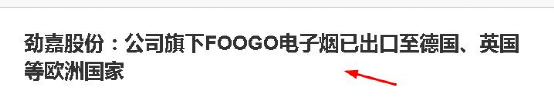 据消息,有投资者向劲嘉股份提问, 请问公司电子烟产品有无出口???公司回答表示,您好,感谢您关注公司!公司旗下FOOGO电子烟已出口至德国、英国等欧洲国家,谢谢!