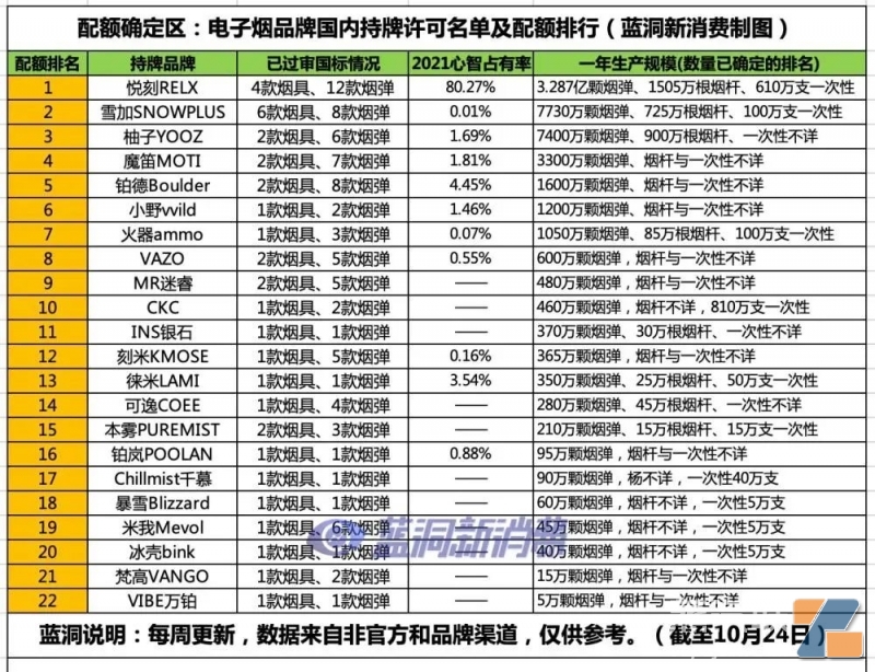 经确认,可逸配额为280万颗烟弹,45万根烟杆,一次性不详,这一生产规模配额目前可以排到已确定配额品牌的第14位。