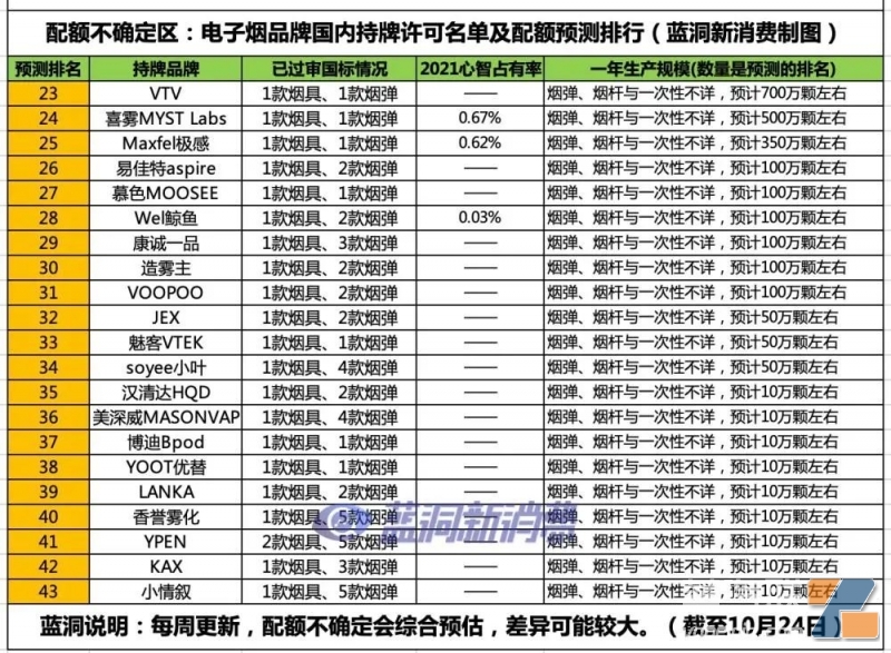 10月24日消息,蓝洞综合汇总的信息显示,上周无新增电子烟品牌产品国标过审,意味着目前已公开的过审品牌数量依然停留在43家,本周蓝洞更新火器与可逸的生产配额。