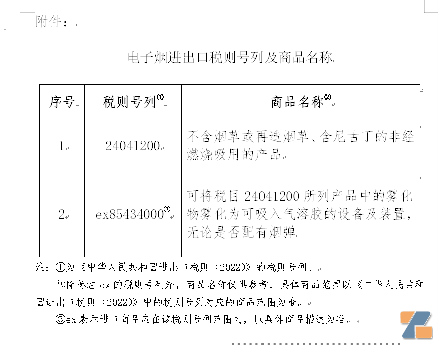 电子烟进出口税则号列及商品名称见附件。