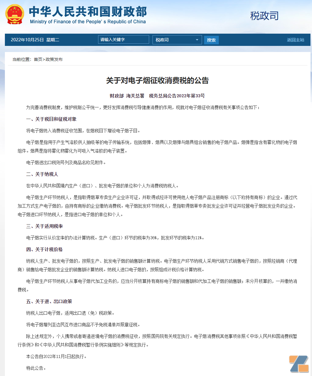刚刚,一则三大部门财政部、海关总署、税务总局公布了《关于对电子烟征收消费税的公告》引发雾化界巨大关注。