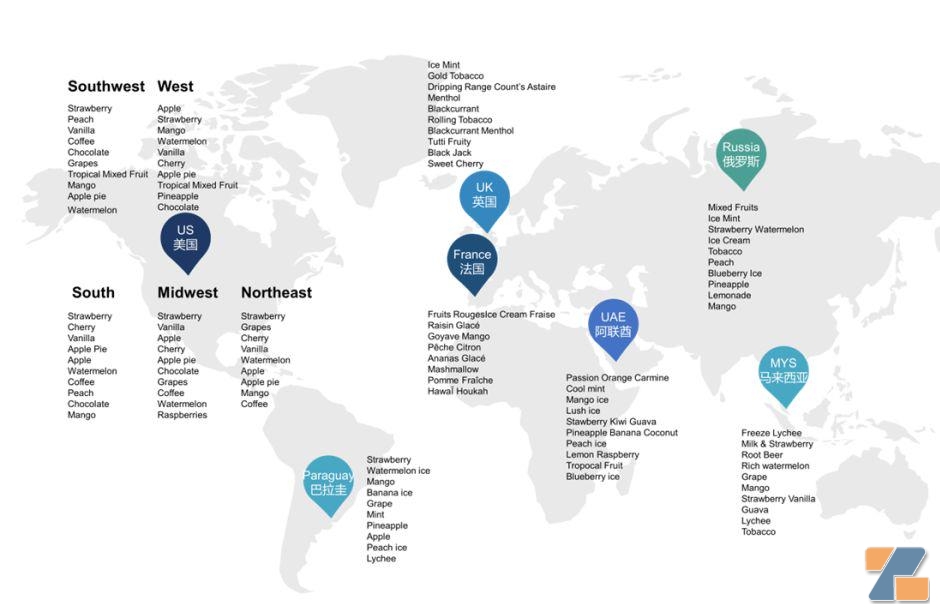 通过联合海外电子烟品牌方搭建专业的营销团队,吉纯生物对全球市场进行更精细化、更细分管理,将美国进一步划分成美东、美中和美西,精准把握局部区域人群的饮食、习惯偏好。构建并逐步完善“吉纯全球口味地图”, 现已覆盖美国、英国、法国、俄罗斯、马来西亚、巴拉圭、阿联酋等主要海外市场,口味精细化布局,是吉纯生物在电子雾化液领域深耕的关键一步。