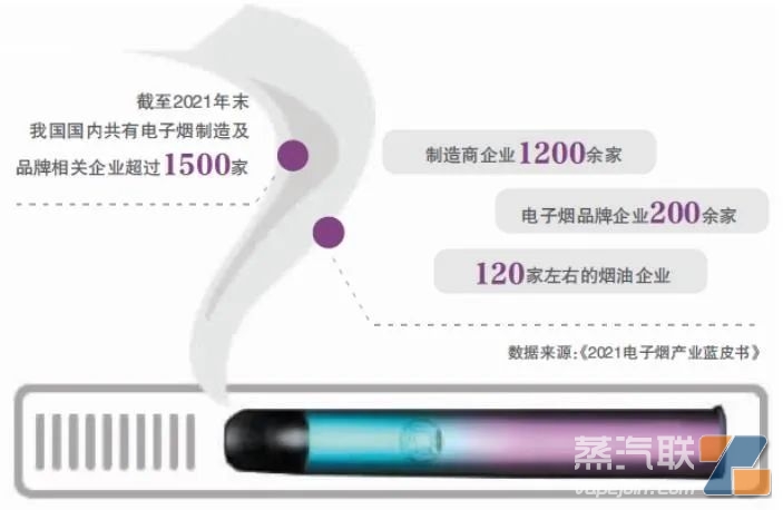 去年末,中国电子商会电子烟行业委员会、卷卷智库联合发布了《2021电子烟产业蓝皮书》,其中提到,截至2021年末,我国共有电子烟制造及品牌相关企业超过1500家,其中,制造商企业1200余家、电子烟品牌企业200余家以及120家左右的烟油企业。