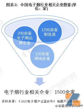 2021年末,由中国电子商会电子烟行业委员会主办的"2021第五届国际电子烟产业高峰论坛"在深圳隆重举行。在高峰论坛上,中国电子商会电子烟行业委员会、卷卷智库联合发布了《2021电子烟产业蓝皮书》。根据《蓝皮书》的数据,截至2021年末,我国国内共有电子烟制造及品牌相关企业超过1500家,其中,制造商企业1200余家,电子烟品牌企业200余家以及120家左右的烟油企业。