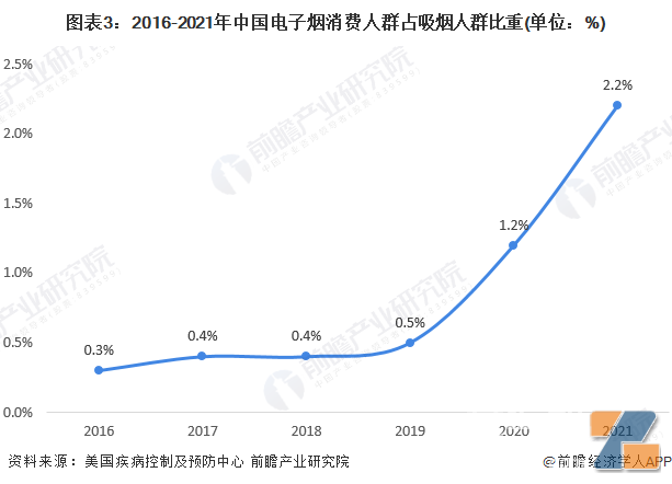 根据美国疾病控制及预防中心的数据,中国烟民中电子烟使用者的渗透率在2020年起快速上升,2021年末预计达到2.2%左右。