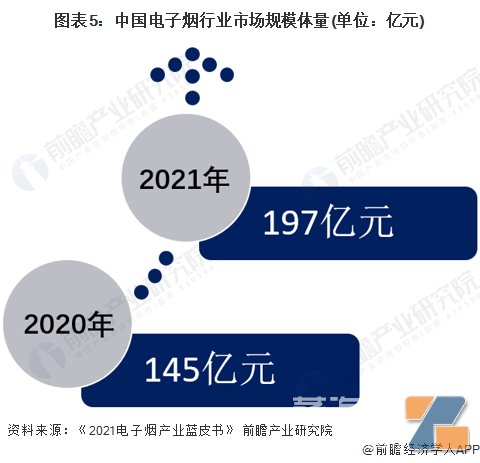 电子烟诞生已有近20年,但从小众亚文化走向大众生活却只是近5年的事。随着近期各类监管政策发布,中国电子烟行业也站在重要的历史节点上。2021年12月17日,在第五届国际电子烟产业高峰论坛上,电子烟行业媒体卷卷智库与电中国电子商会电子烟行业委员会在论坛上发布了《2021电子烟产业蓝皮书》。根据《2021电子烟产业蓝皮书》的数据,2021年中国电子烟行业的市场规模达到了197亿元,同比增长36%。