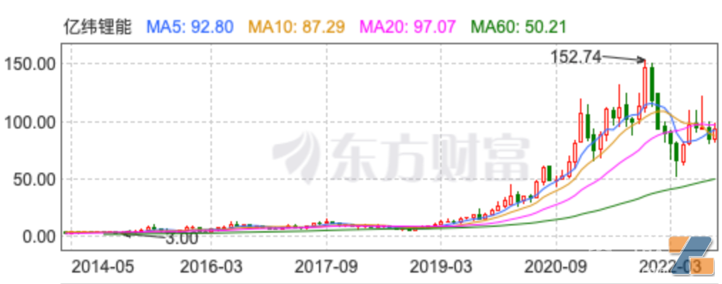 相伴多年,与思摩尔国际“绑定”的亿纬锂能股价也一路飙升。2020年7月,亿纬锂能的股价维持在50元左右,到2021年1月股价就已经提升到了90元左右。到2021年11月26日收盘,亿纬锂能收盘市值高达2823.65亿元,达到历史最高点。此后数天,公司盘中股价突破150元。