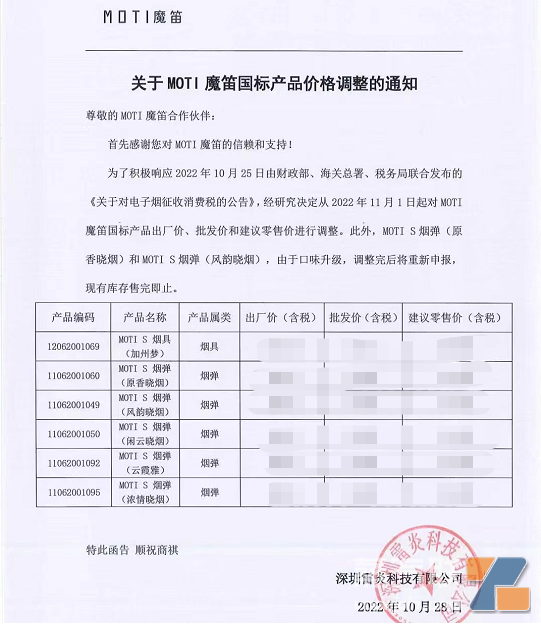 其中魔笛烟具批发价涨价幅度为129%,建议零售价涨幅为126%。从魔笛S烟弹批发价格来看,烟弹套装涨价幅度为68.8%,建议零售价涨幅为67.8%。说明魔笛整体调价都在60%以上。