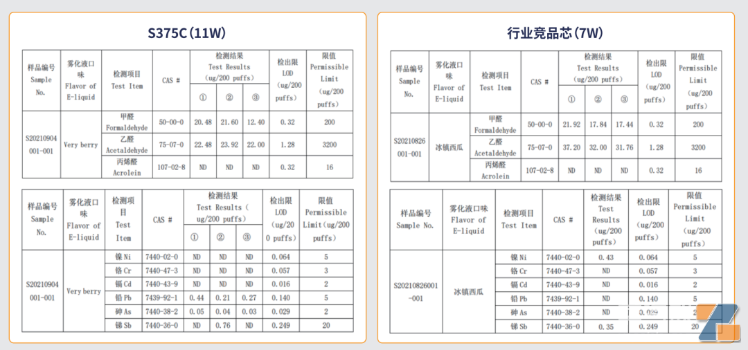 我司厚膜陶瓷雾化芯可实现高低功率的统配,以下为对比数据:通过第三方检测,产品在11W高功率的情况下,仍可保证烟气的安全性,符合标准。