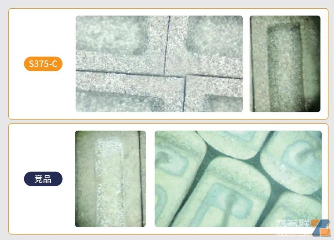 下图可看出我司产品凹槽内部无粘粉现象,同行竞品粘粉严重,从而可看出我司通过这种特殊工艺,使产品表面更干净,无粘粉。