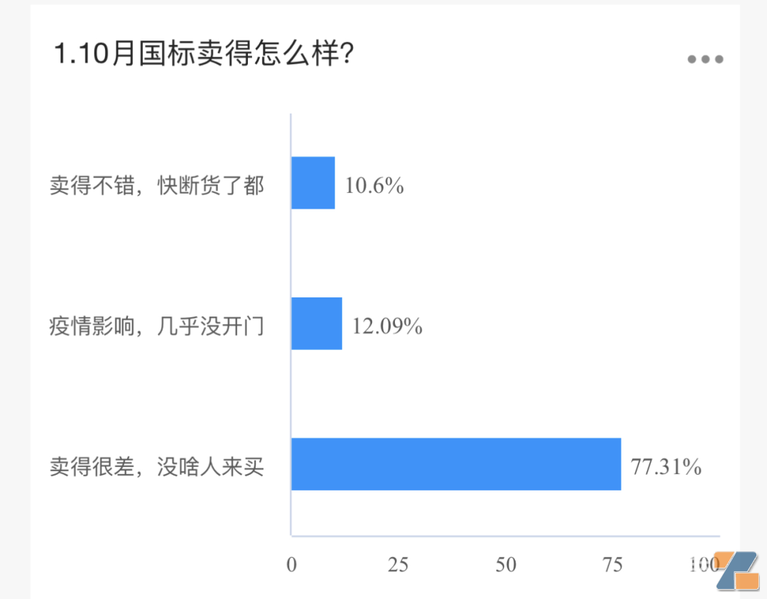 77%的店主表示10月国标卖得很差,有12%的店主表示受疫情影响没开门,11%的店主表示卖得不错。