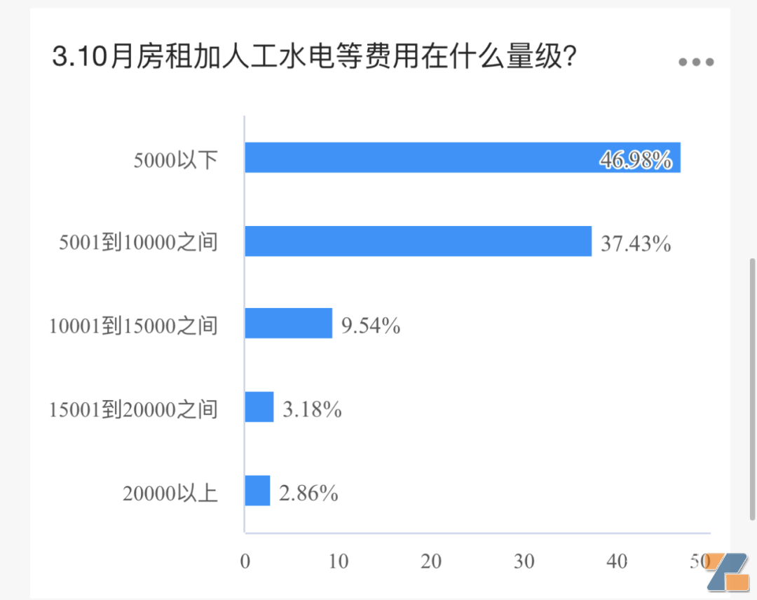 47%的店主房租在5000以下,5000到1万之间的占比37%,也就是房租在1万以下的比例有84%。