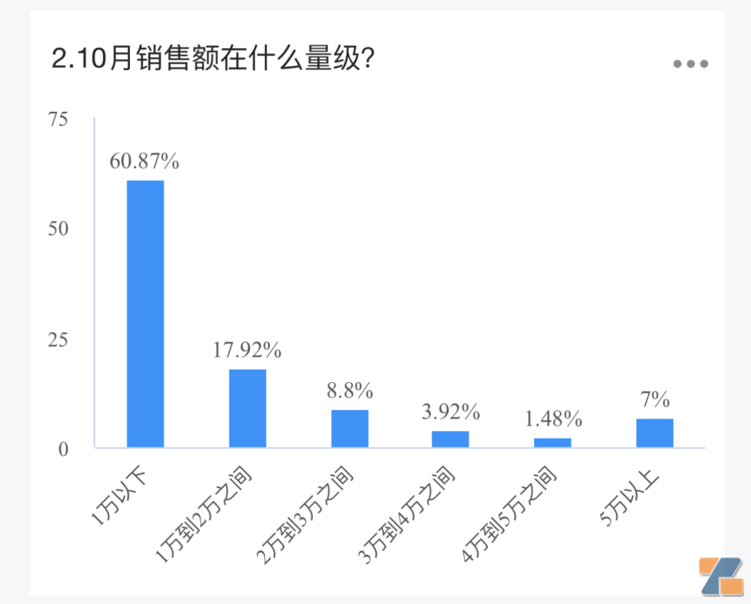 61%的销售额在1万以下,18%处于1万到2万之间,9%店主处于2万到3万之间,也就是说,3万以下销售额的比例占到87%。