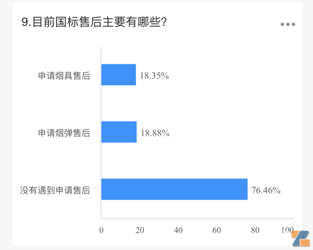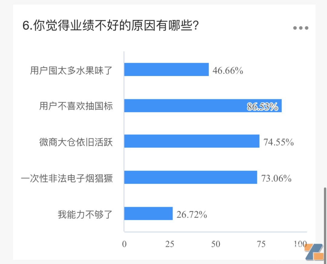 其中,用户不喜欢抽国标高居榜首,占到87%。微商大仓和一次性非法电子烟猖獗也对店主业绩造成了影响,比例均在73%左右。