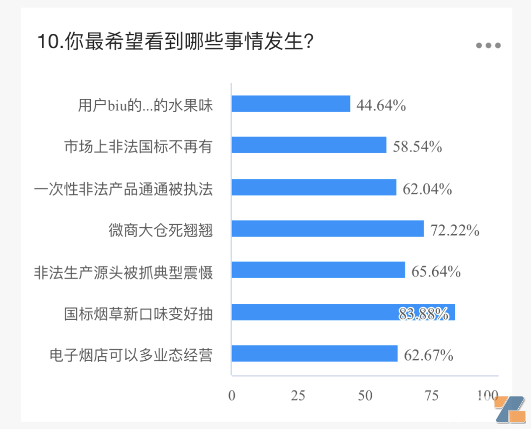 84%的希望国标烟草口味变好抽。72%希望微商大仓退出,65%希望非法生产源头被抓典型。