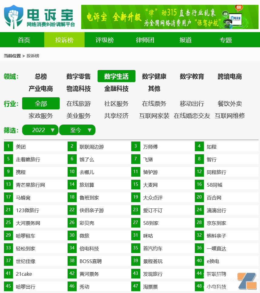 据国内知名网络消费纠纷调解平台“电诉宝”(315.100EC.CN)显示,2022年至今数字生活领域的投诉事件按投诉量排名依次为、美团、联联周边游、万师傅、如程、走着瞧旅行、饿了么、飞猪、智行、携程、去哪儿、骑驴游、同程旅行、青芒果旅行网、旅划算、大麦网、58同城、马蜂窝、鲁班到家、大众点评、百合网、123微旅行、侠侣亲子游、爱订不订、滴滴出行、大河票务网、彩贝壳、58到家、京东到家、哈啰租车、微旅、咪咕、蝌蚪亲子、轻松到家、倍电科技、首汽约车、一喂直达、世纪佳缘、BOSS直聘、景程荟玩、e换电、21cake、黄河票务、发现旅行、智联招聘、哈啰出行、秀动、淘票票、小电科技。