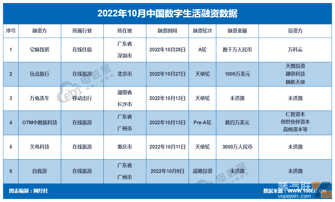 据网经社旗下电商大数据库“电数宝”(DATA.100EC.CN)监测数据显示,2022年10月数字生活领域共发生6起融资,融资方为宅猫找房、玩点旅行、万兔洗车、OTM中数旅科技、久电科技、自我游,融资总额约1.3亿元。
