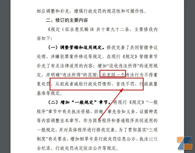 规定提到,增加“没收违法所得”的适用规定,并明确“违法所得”的范围;补充同一个违法行为不得重复处罚、从轻或者减轻行政处罚情形、首违不罚、行政裁量基准等规定。