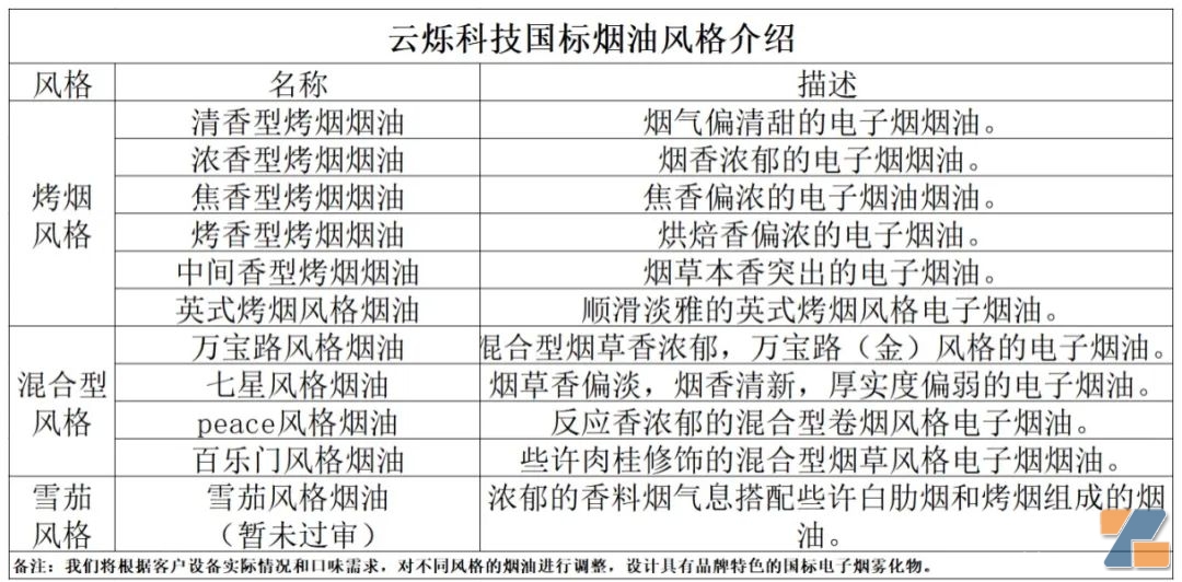 云烁科技基于传统烟草多年积累,优选各地区优质烟草原料,初步开发出具有不同风格特色的电子烟专用烟草提取物二十余款,可搭配不同风格的烟草净油、烟草挥发性提取物和多样化的雾化物添加剂模块,开发出香气浓郁,口感细腻饱满的国标烟油供客户选择。