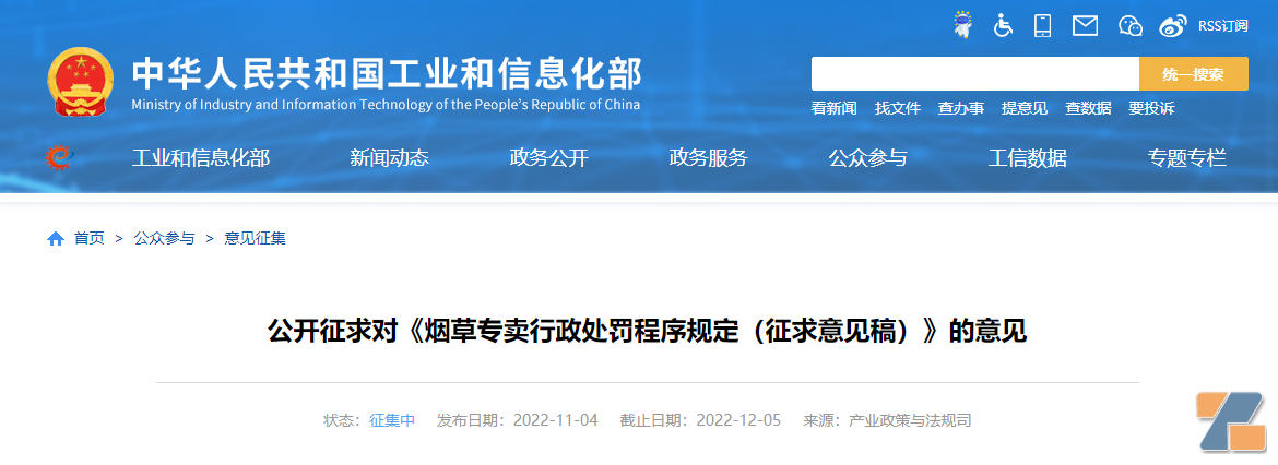 工信部网站11月4日消息,为贯彻落实新修订的《中华人民共和国行政处罚法》,规范烟草专卖行政处罚程序,保护公民、法人或者其他组织的合法权益,工业和信息化部对《烟草专卖行政处罚程序规定》进行了修订,形成了《烟草专卖行政处罚程序规定(征求意见稿)》。现向社会公开征求意见,请于2022年12月5日前反馈意见。
