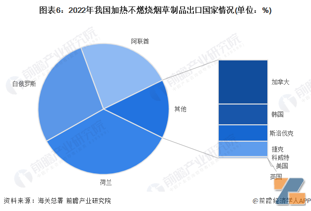 从我国加热不燃烧烟草制品(海关编码24041100)出口情况来看,我国2022年上半年加热不燃烧烟草制品出口规模为317.91万美元,其中主要市场集中于荷兰、白俄罗斯、阿联酋等地,美国和英国市场占比较小。