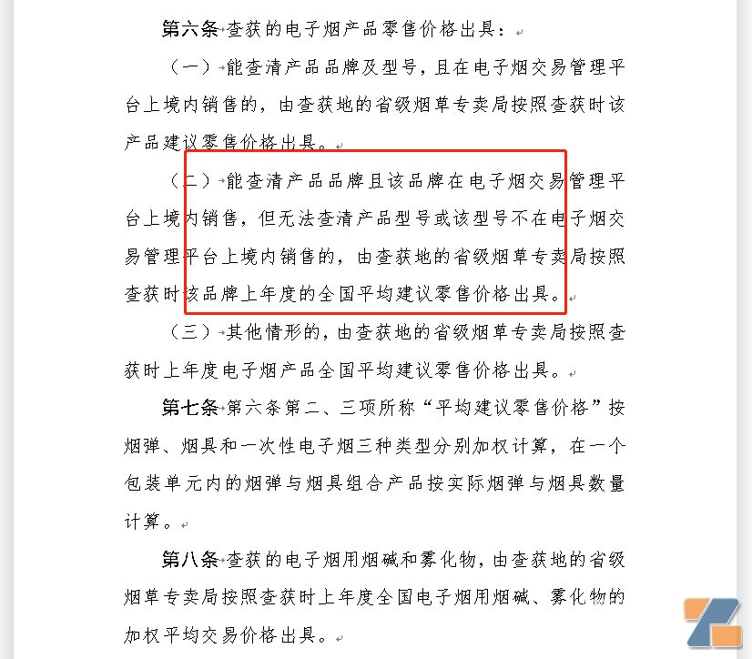 细则指出,能查清产品品牌且该品牌在电子烟交易管理平台上境内销售,但无法查清产品型号或该型号不在电子烟交易管理平台上境内销售的,由查获地的省级烟草专卖局按照查获时该品牌上年度的全国平均建议零售价格出具。