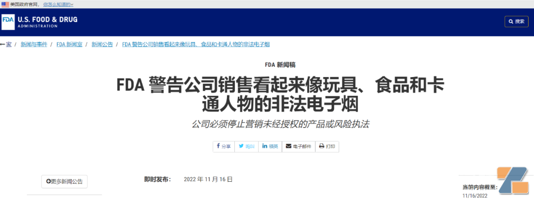 除了本次发出的警告信外,截至10月28日,FDA已向非法销售含有烟草尼古丁电子烟的公司发出440多封警告信,向非法销售含有非烟草尼古丁电子烟的公司发出60多封警告信。