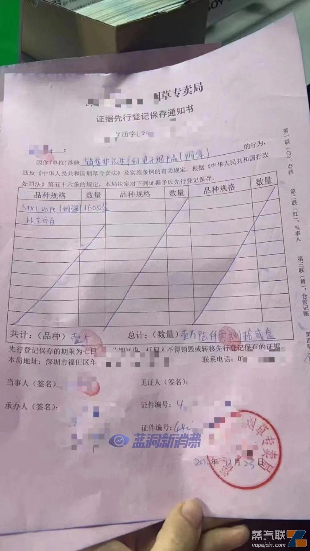 通知书显示,该名人士因涉嫌销售非法生产的电子烟产品的行为,违反了烟草专卖法及实施条例有关规定,根据行政处罚法第五十六条规定,对上述证据进行先行登记保存。