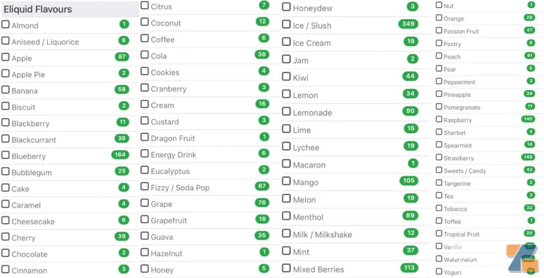 基于VapeClub口味分类标签,我们大致可以将英国市场一次性口味大致分为水果、饮品、甜品、糖果、坚果、酱、香料几类。在总共多达71个口味标签中,与水果相关的标签多达31个,占比高达44%。换言之,果味为英国一次性市场的绝对主力。