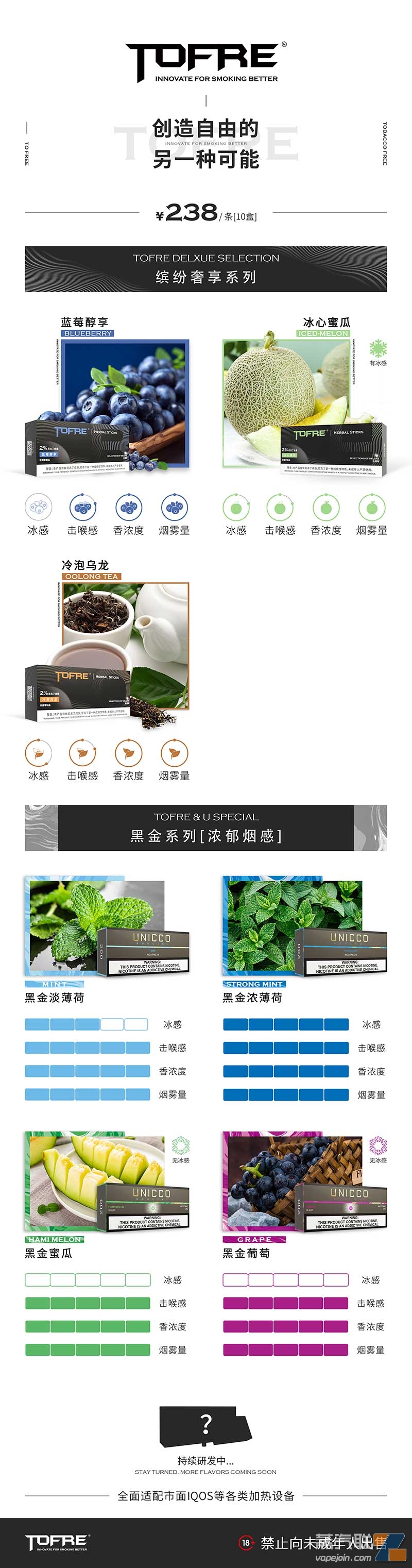 TOFRE福瑞虽然是茶叶做的,但它里面添加了提纯的尼古丁盐,能达到解烟瘾的效果。它和主流的电子雾化烟是两种不同的展现方式。
