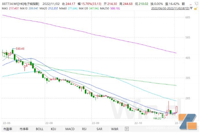 11 月 2 日,电子烟板块再次迎来一波反弹。万得香港电子烟指数(887734.WI)上涨 15.7%,同期龙头思摩尔国际涨停,雾芯科技上涨 9.6%,中烟香港、华宝国际、顺灏股份上涨约 5%。