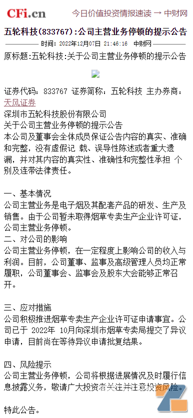 12月8日消息,新三板挂牌电子烟公司五轮科技发布公告称,因暂未获得电子烟生产许可证,且申请异议仍在等待,导致公司主营业务停顿。