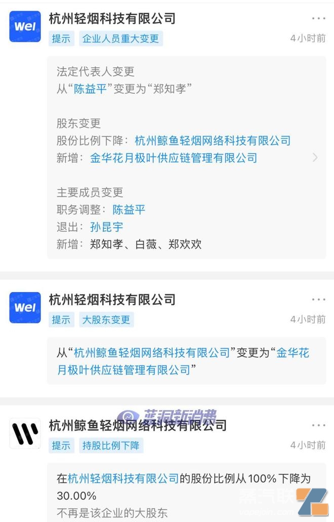 12月9日消息,据企查查信息显示,已过审电子烟品牌Wel鲸鱼运营公司杭州轻烟科技有限公司近期发生多项变更。