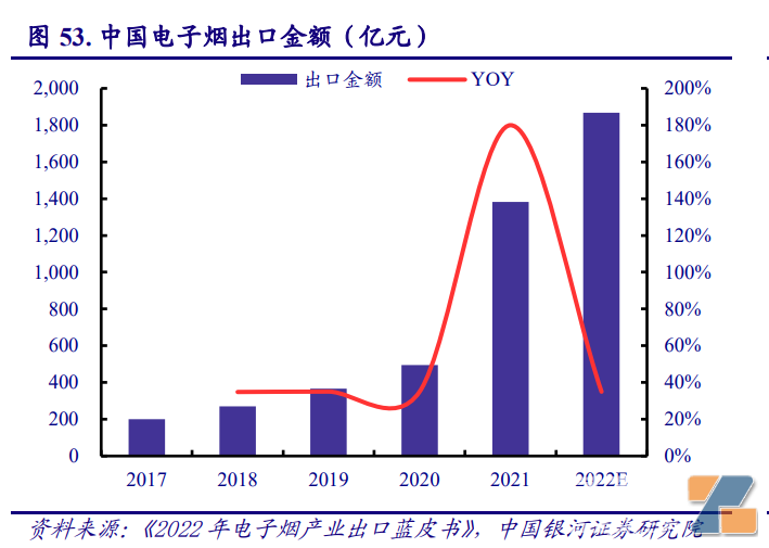 中国雾化电子烟产业实现全球领 先,据“2021 第五届国际电子烟产业高峰论坛”,中国电子雾化的专利占了全球相关专利的 90%,产能占到全球产能的 95%,产品出口到全球 200 个以上的国家和地区。据《2022 年电 子烟产业出口蓝皮书》数据显示,中国电子烟产业已有超 4 成企业进行产业链全球化布局, 电子烟出口规模快速扩张,预计 2022 年出口金额将达到 1,867 亿元,同比增长 35%。