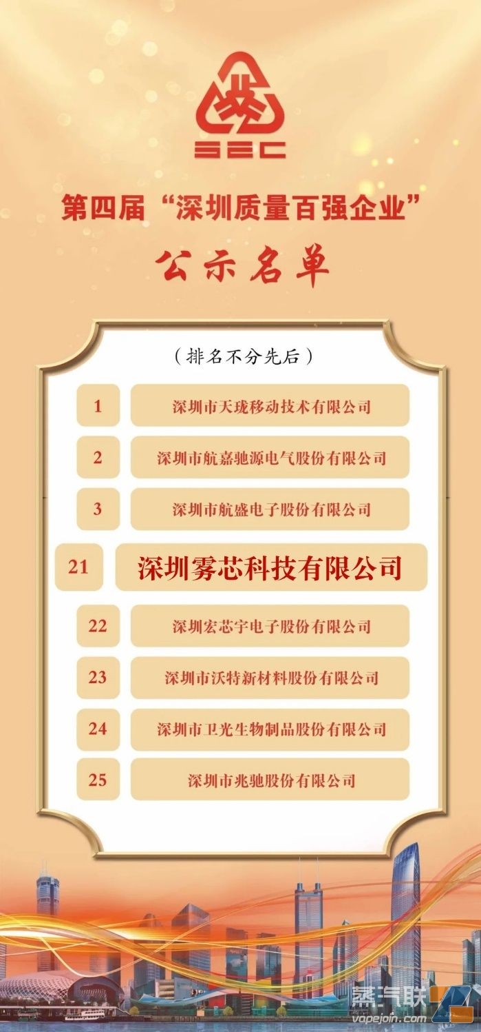 (图:雾芯科技上榜第四届“深圳质量百强企业”公示名单)