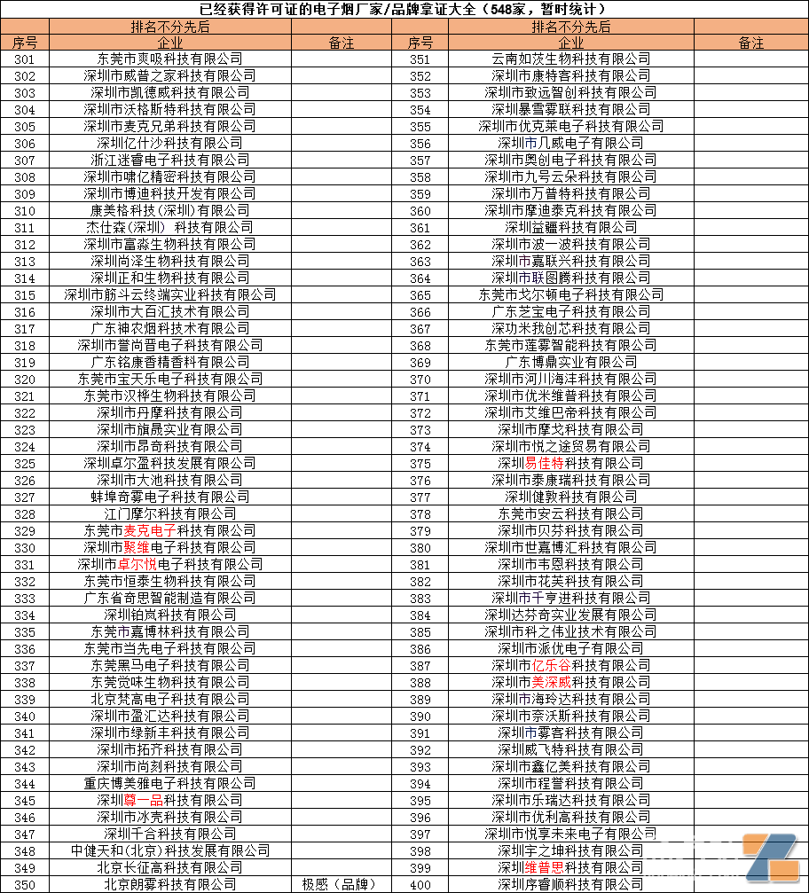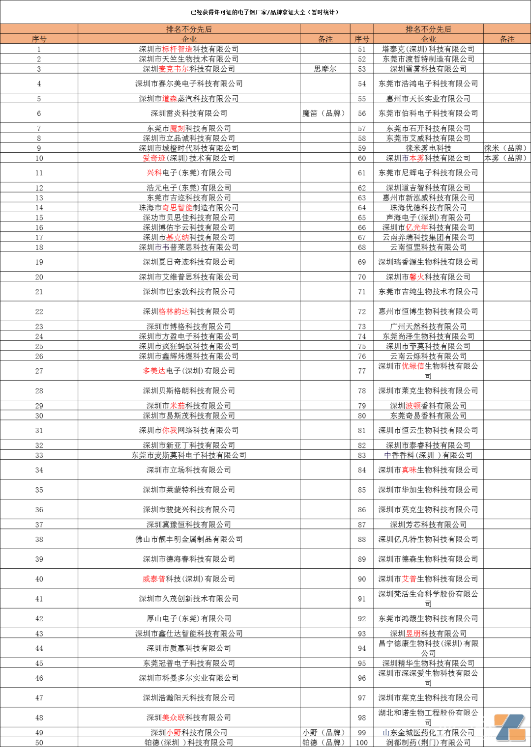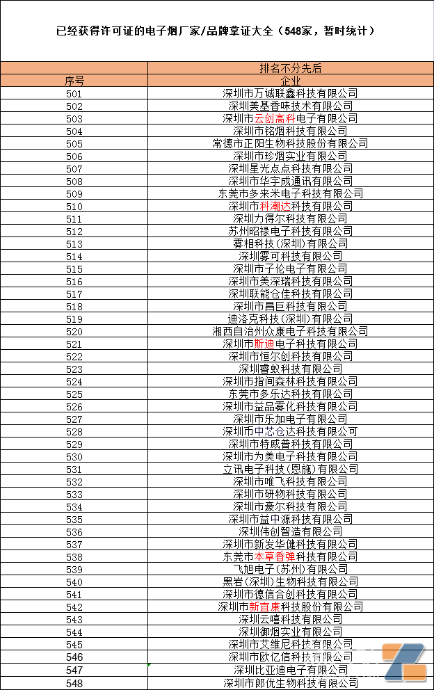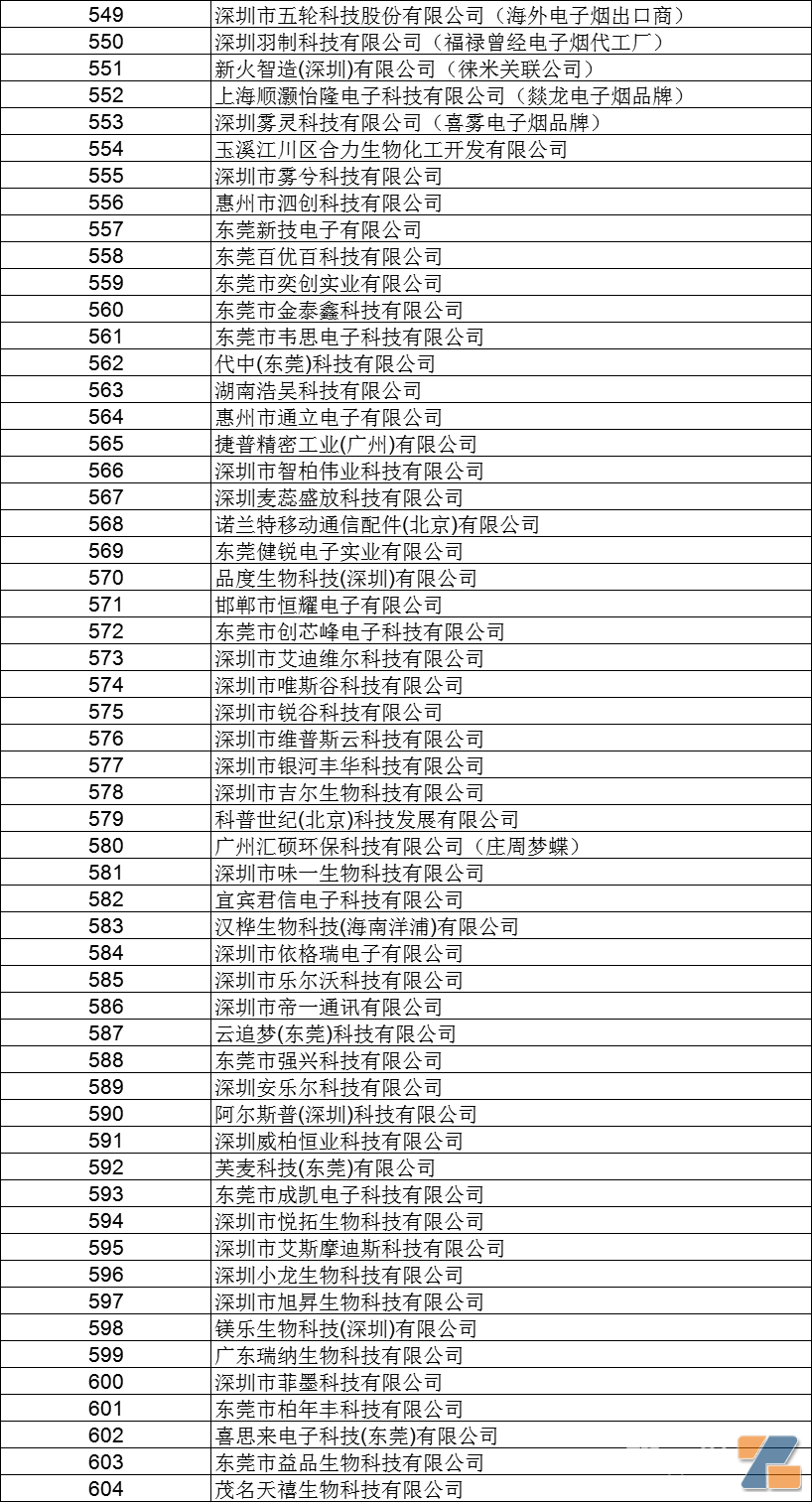 下面是604家拿证(先前548+56)的电子烟厂家/品牌全名单(暂时统计):