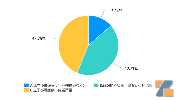 而店主们的答案给出了一个值得玩味的信息:只有不到14%的店主认为,行业的低迷是从业者的整体素质不足使然,而超过86%的店主,而认为是品牌的不负责和行业的内卷大势破坏了终端生态。