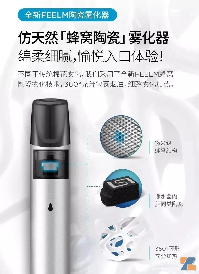 雾化芯是第三代FEELM陶瓷芯,绵柔好抽