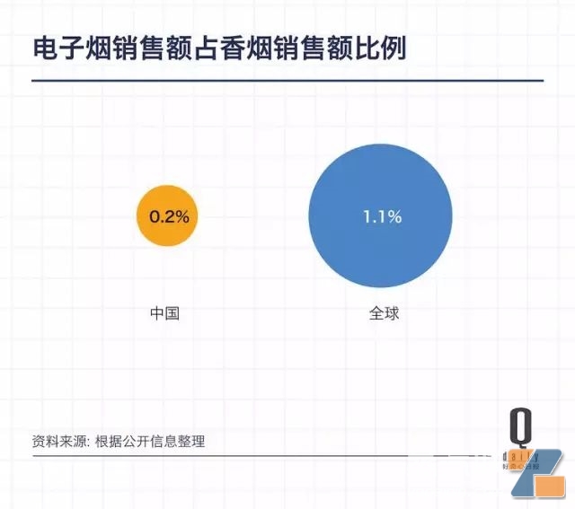 电子烟在中国的消费还远不到这样的规模。中国香烟销售额在 2015 年为 1.42 万亿元,电子烟还不到该数字的 0.2%。而全球市场,电子烟比香烟的销售额大约是1.1%。中国电子烟的增长也相对全球 51%的速度慢了许多:近五年的年复合增长率为 17.5%。