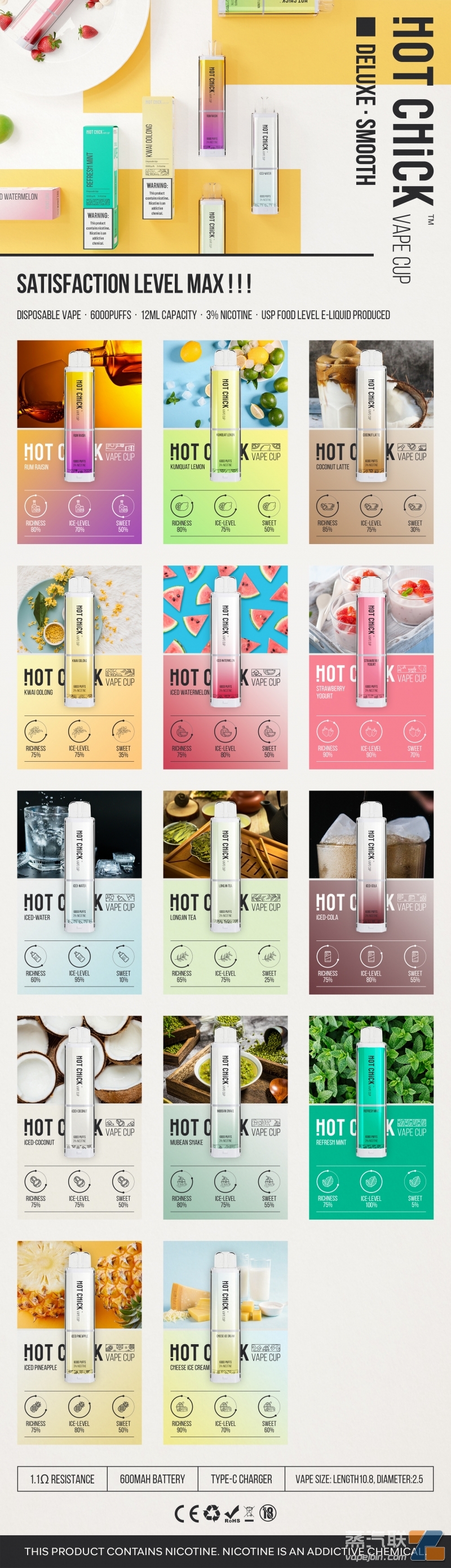 在烟油配方上,小hot chick采用USP食品级的天然烟碱形态尼古丁,食用级级别的甘油等原料,通过业内资深专家调配烟弹口味。目前,小hot chick共推出了14种口味烟弹,超大雾量烟弹所带来的尼古丁满足感是其他一次性不能比拟的,顶级原材料带来的是不齁嗓,丝滑顺喉,冰感满足到位的抽吸体验。