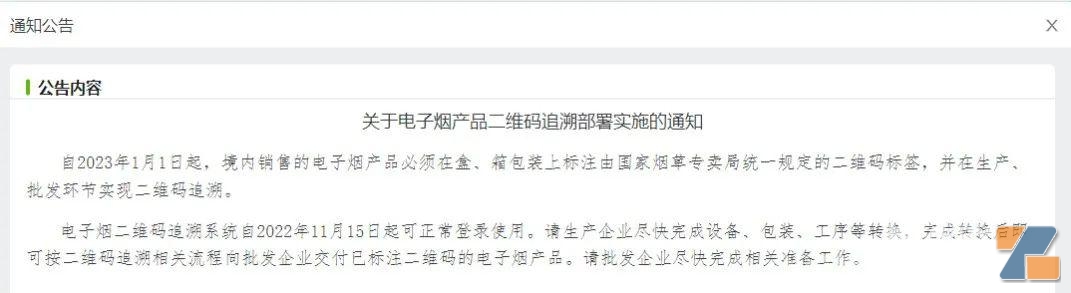 通知称,电子烟二维码追溯系统自2022年11月15日起可正常登录使用。请生产企业尽快完成设备、包装、工序等转换,完成转换后即可按二维码追溯相关流程向批发企业交付已标注二维码的电子烟产品。请批发企业尽快完成相关准备工作。