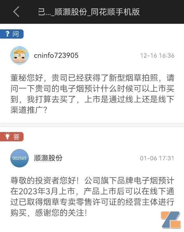 近日,有投资者向顺灏股份提问, 董秘您好,贵司已经获得了新型烟草拍照(牌照),请问一下贵司的电子烟预计什么时候可以上市买到,我打算去买了,上市是通过线上还是线下渠道推广?